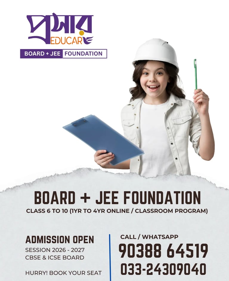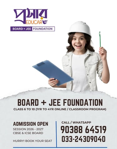 Prashar Educare presents a comprehensive JEE + Board Foundation Course designed to help students from Class 6 onwards build a strong academic base for future success. The program integrates school syllabus with JEE preparation, ensuring conceptual clarity, analytical thinking, and problem-solving skills. With research-based study materials, experienced mentors, and a structured approach, this course empowers students to excel in both Board Exams and JEE right from the foundation years.
